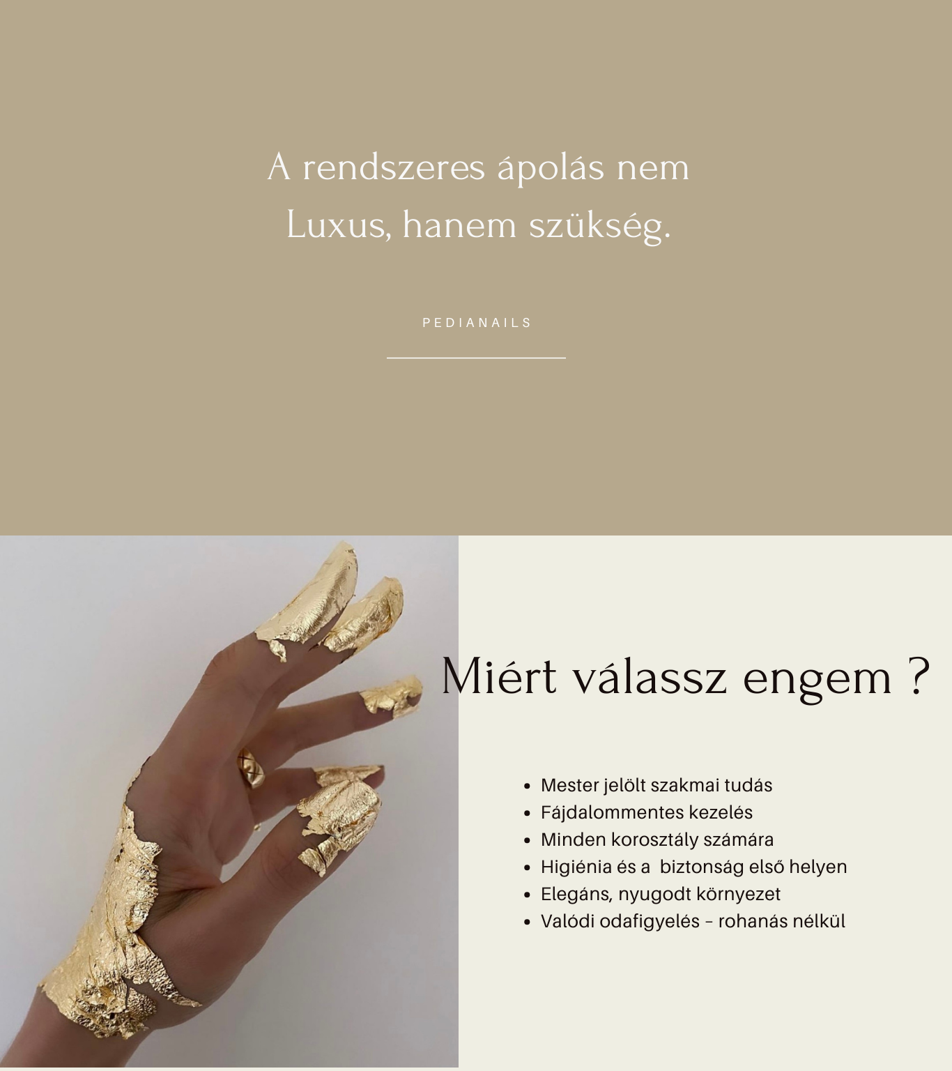Kérlek, válaszd ki a számodra legmegfelelőbb szolgáltatást: akár kéz-, akár lábkezelésre érkezel, minden folyamatot a te kényelmedhez és igényeidhez igazítok.